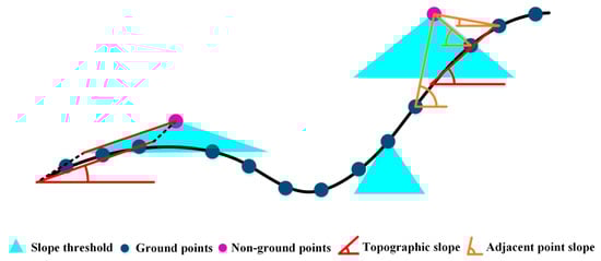 The slope-based filters are based on the assumption that the large slope between two nearby points is mainly caused by an OBJ point, i.e., the higher one [25]. In other words, one point is flagged as the BE if the maximum slope between this point and its neighbors does not exceed the predefined tolerance. To improve the performance on steep slopes, some adaptive slope-based filters were developed [26,27], where the slope threshold adaptively changes with respect to terrain slope (Figure 1). Moreover, some scholars [28,29] enhanced the slope-based filters with the inclusion of elevation difference threshold. Generally, the slope-based filters have the advantages of simplicity and efficiency. However, they are highly sensitive to slope threshold, especially in areas with abrupt terrain [30].