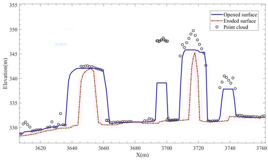 Morphology-based filters are mainly based on two fundamental operations, i.e., dilation and erosion. The combination of dilation and erosion produces opening and closing operations, which are employed to filter point clouds in the morphology-based filters (Figure 2). More specifically, the raw point clouds are first rasterized based on the lowest points within a given window size, and then processed with the opening operation. Finally, points with elevation differences before and after the operations greater than the tolerance are flagged as OBJ points [31]. However, the performance of the morphology-based filters is greatly influenced by the window size, which cannot keep a good tradeoff between the removal of large-size objects and the preservation of detailed ground points. Thus, progressive morphological filters were proposed [32,33], where the window size of the filter and elevation difference threshold are gradually increasing. Since the morphological filters operate on the rasterized point clouds, they have a low computational cost. However, the transformation from the raw point cloud into the rasterized image inevitably causes information loss, especially in steep slope areas.
