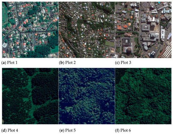 Orthoimages of the six study sites. Plots 1–3 belong to urban areas (a–c) and plots 4–6 belong to forest areas (d–f).