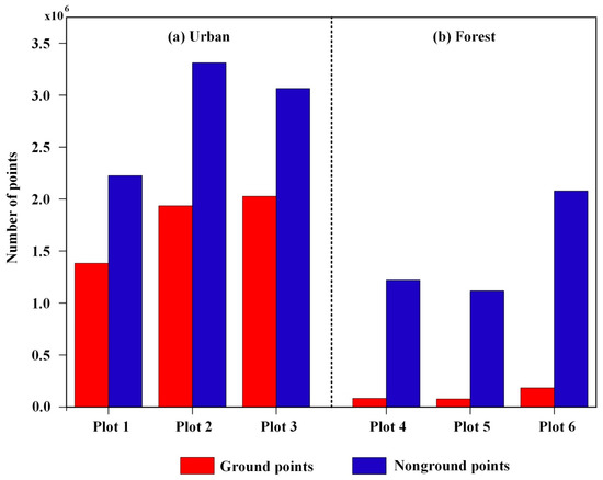 Six datasets with different terrain characteristics were employed to assess the performance of the classical filtering algorithms, where three (plots 1–3) are located in urban sites and three (plots 4–6) in forest sites (Figure 6). The detailed information for data collection is shown in Table 1.