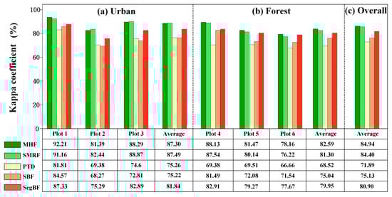 Kappa coefficients of all the filtering algorithms on the six plots including (a) urban, (b) forest and (c) overall areas.