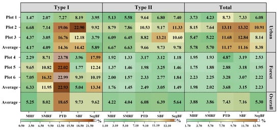 In previous studies, the ISPRS datasets with 15 samples [11] were widely adopted to assess the performance of the filtering algorithms. Thus, the results of the five filtering algorithms on the ISPRS datasets extracted from the corresponding published papers [11,42,61,63] are shown in Figure 13. On average, SMRF with the optimized parameters (SMRF-O) produced the best results on urban, forest and overall landscapes. MHF ranked the second, which was followed by SMRF with the single parameter (SMRF-S). This indicates the importance of parameter optimization for SMRF. However, this is a nontrivial and time-consuming task for SMRF, since it includes five parameters. Surprisingly, SBF and SegBF showed much lower accuracy than PTD, which is different from the results in our test (Figure 10). The poor performance of the former is mainly due to the low sample density of ISPRS point clouds, which poses great challenges on optimal slope threshold determination and point cloud segmentation for SBF and SegBF, respectively. This further validates the different performance of the filtering algorithms on point clouds of different density.