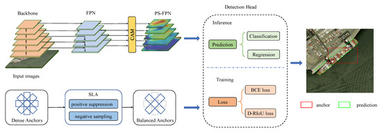 The overall framework of our method is shown in Figure 2. Our proposed model consists of three parts: sparse label assignment strategy (SLA) for training sample selection, position-sensitive feature pyramid network (PS-FPN) for feature extraction, and distance rotated IoU loss (D-RIoU) for network training. The following sections will introduce these modules in detail.
