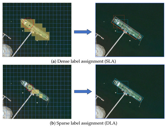 in which is the predefined NMS threshold. t denotes the training process, and . Through Equation (1), the threshold of the posterior NMS in the training process gradually decreases, and, thus, the suppression intensity is gradually increased. In this way, we not only ensure a stable training process but also improve the detection performance by suppressing redundant positive samples. For example, as shown in Figure 3a, the model trained with DLA predicts two highly overlapped detections. However, we cannot guarantee the more accurate one (blue box) can be output. As shown in Figure 3b, this issue can be resolved through SLA by suppressing the positives with suboptimal predictions. SLA ensures the sparse valid predictions for each location on feature maps.