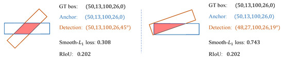 Another thorny issue in object detection in aerial images is the inconsistency between training loss and localization accuracy. The current mainstream regression loss function is the smooth-L loss, which uses the offsets of the prediction box and GT box relative to the anchor for training. However, the smooth-L cannot accurately represent the localization accuracy of the detections. For example, as shown in Figure 5, the two different detection boxes have the same rotated IoU (RIoU) with GT box, but their regression losses are different. Under the supervision of the smooth-L loss, the detector pays more attention to the case on the right in the Figure 5. However, the detection box on the left has only a tiny angle offset relative to the GT box, which is easy to optimize. The inconsistency between the regression loss function and the localization accuracy of the detections hinders the optimization of the regression, making it hard for the network to converge.