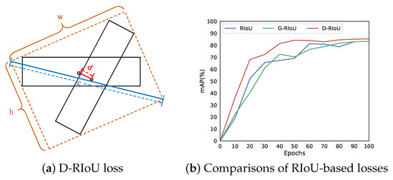 The performance evaluation of D-RIoU loss is shown in Figure 6b. G-RIoU loss is extended from GIoU loss [46] in generic object detection and is as follows: