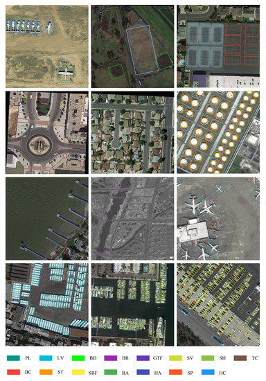 DOTA [22] is the largest public dataset for oriented object detection in aerial images. The images in DOTA are of the size in the range from 800 × 800 to 20,000 × 20,000 pixels and contains objects with a wide variety of scales, orientations, and shapes. It includes 2806 aerial images with 188,282 annotated instances. There are 15 categories in total, including plane (PL), baseball diamond (BD), bridge (BR), ground track field (GTF), small vehicle (SV), large vehicle (LV), ship (SH), tennis court (TC), basketball court (BC), storage tank (ST), soccer ball field (SBF), roundabout (RA), harbor (HA), swimming pool (SP), and helicopter (HC). The total dataset is divided into training set, validation set, and testing set with the proportions of 1/2, 1/6, and 1/3, respectively.