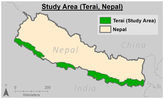 Nepal is a diverse country—culturally, ecologically, and geographically. Within its borders there are 118 ecosystem types and 35 distinct forest types. Nepal is composed of five physiographic regions: the High Himal (part of the Himalayas including Mt. Everest; up to 8848 m elevation above mean sea level), the High Mountains (543–4951 m elevation), the Middle Mountains (110–3300 m elevation), the Churia (93–1955 m elevation), and Terai (the lowland plains; 63–330 m elevation) [28]. In this study, we focus on the Terai region (Figure 1), which makes up 13.717% of Nepal’s geographic area. The region, which is 20.88% forest and other wooded land area, contains a great amount of forest biodiversity, varied types of forest management practices, and a disproportionately high amount of forest disturbance activities. The four most prevalent forest types in Terai are Khair Sissoo, Sal, Tropical Mixed Hardwood, and Subtropical Mixed Hardwood. The climate of the Terai region is subtropical and characterized by monsoon seasons (June–September) and dry winters (December–February) [29]; in general, trees undergo leaf bud burst in February–April as temperatures rise and the rainy season begins, with greatest leaf cover around August and minimum leaf cover around January [30]. Average above-ground biomass is approximately 196 t/ha [29]. The Terai has been experiencing more urbanization and population densification due to migration from other physiographic regions, which has led to a higher demand for forest products [31]. Terai is the only region in Nepal where demand consistently outpaces supply for both timber and fuelwood. This pattern is projected to continue well into the future [17,21]. We studied these forest changes within the time period of 2010–2020.