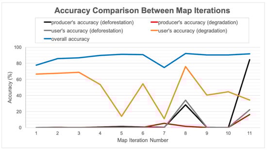 Comparison of overall map accuracy and user’s and producer’s accuracy for the map iterations of CODED described in Table 1.