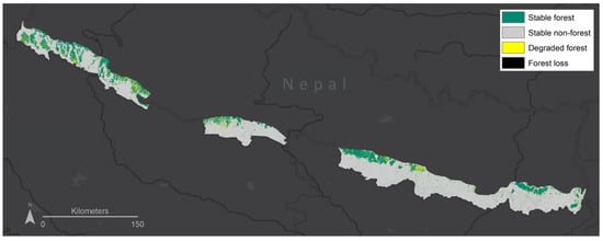 The direct drivers of forest disturbance in the Terai physiographic region have variable impacts on the landscape that result in different patterns of forest disturbance. For example, urbanization and infrastructure development result in deforestation, permanently converting forest to another land cover type, while selective/illegal logging and livestock grazing result in forest degradation, the reduction in forest cover/quality without a full land cover conversion. Forest degradation events vary both in degree (partial to entire loss of forest cover) and temporal magnitude (short-term to long-term reduction in forest cover). Of particular concern in the Terai region is selective/illegal logging, which results in small-scale and widespread canopy loss. Recent studies suggest that forest degradation is an underreported source of carbon emissions [14,32,33,34], making accurate area estimates of both deforestation and forest degradation critical to accurately estimating carbon impacts.