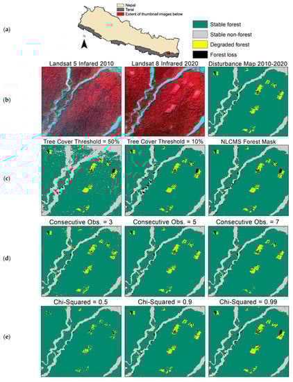 Thumbnail images showing the effects of changes to three parameters. (a) The location of the region for the thumbnail images is in the southeastern Terai region, and a color key for maps in the figure. (b) Thumbnail images of the region of interest, with Landsat data from 2010 and 2020 displayed as infrared composite imagery. (c) Comparison of different forest masks: two forest canopy thresholds using the GFW forest mask and the NLCMS forest mask. (d) Comparison of different numbers of consecutive observations. (e) Comparison of different values of chi-squared. (f) Comparison of different NDFI change magnitude thresholds, a post-processing parameter. Aside from the parameter indicated below each image, all parameters used to create it are the same as those selected in iteration 11.