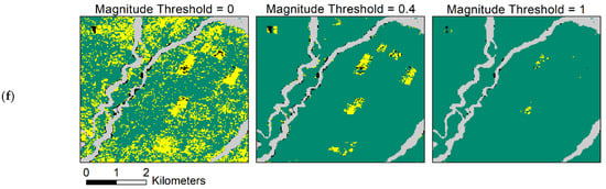 The CODED algorithm uses chi-squared to control the size of the window for detecting statistical change. A change magnitude threshold variable that filters out low-magnitude change detections that may be erroneous or insignificant is applied in post-processing. Changing either of these parameters notably increased or decreased the amount of change that was detected (Table 3, Figure 4). The data pre-processing parameters that we tested, including creating temporal composites of the input data, did not have as strong an impact. To better prepare future users for what to expect when iterating through some of the most influential variables within CODED, we completed model runs changing only one parameter at a time and displayed the resulting map effect on a region from our study area known to have degradation from timber harvesting and deforestation (Figure 4).