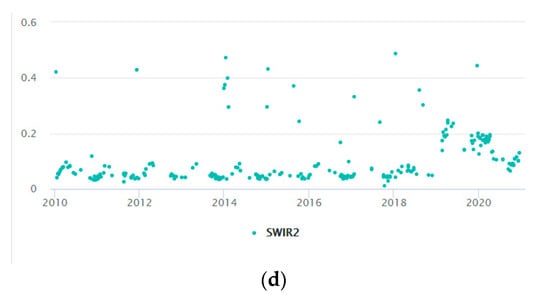Further, as we were reviewing model iterations in CEO, we found patterns of omission error that provide important insight into NDFI, SMA, and CODED. One pattern of omission error is the result of NDFI saturating at 1 and not capturing variation in Terai (Figure 5; note comparison with SWIR2, which was not used for analysis but is shown here to demonstrate a nonsaturating signal). Specifically, under certain ecological conditions, NDFI reaches a maximum value prematurely such that it does not capture all of the variation. The ecological conditions noted here are high leaf density during the height of the monsoon season around August [30]; further exploration of the saturation phenomenon may reveal additional conditions. As the CODED model is based on SMA, this observation suggests that the spectral end member approach may need to be recalibrated for our study area, and potentially other study areas as well. The spectral signature definitions for the end members used in CODED and NDFI were generated for the Amazon [26,27]. Although both CODED [32] and NDFI have been successfully used in other environments (e.g., West Africa; [44,45]), the assumption that the same end members work for Nepal and areas outside of the Amazon must be further examined. Other researchers working in Southeast Asia have also made note of issues with the SMA approach. For example, in Kalimantan researchers found that spectral end-member selection needed to be adjusted to account for differences in terrain and atmospheric conditions causing variation in spectral reflectance [46,47,48].