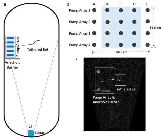 Tests were conducted at the Aquatic Research Laboratory at the Pacific Northwest National Laboratory (PNNL) in an oval-shaped fiberglass test tank (7.3 m long, 3.0 m wide, and 2.5 m deep) (Figure 1a). The water was pumped from the adjacent Columbia River and the temperature ranged from 10.5 to 11.0 °C. Two water flow speeds were tested (0.53 and 0.76 m/s) and each eel was swimming for a total of three to five minutes at each flow speed. To create the two flow speeds, a stacked array of twenty independent submersible pumps (Pentair Flotech, Model FP0S3000X, London, UK) in a 4 × 5 grid (Figure 1b) were mounted in an aluminum frame, which rested on a raised platform (Figure S2). Details of the setup of the pump array and the generation of the flow field are included in the Supplementary Materials. To reduce reflections from the pump array and platform, two sections of 122 × 61 × 2.65 cm (length × width × thickness) anechoic material (Precision Acoustics AptFlex F48, Precision Acoustics Ltd., Dorchester, Dorset, UK) were used, which can absorb sound in the 10 kHz to 1.5 MHz band.