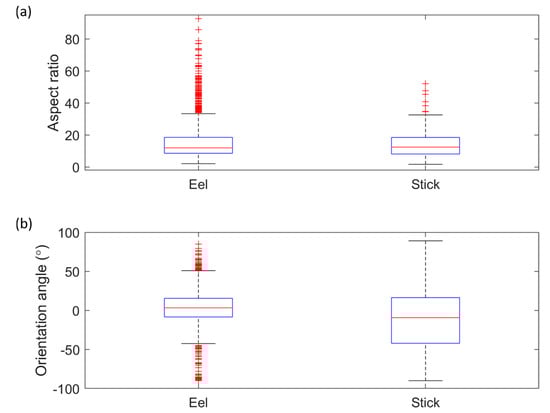 The aspect ratio and orientation angle of eels and sticks are shown in Figure 6, with the results of individual targets in the Supplementary Materials (Figures S4 and S5). The summary statistics of aspect ratio and orientation angle illustrate clear differences between eels and neutrally buoyant sticks in sonar images. Eels have more variability than sticks in both aspect ratio and orientation angle. The observations were consistent with our assumption that non-eel objects usually have a more rigid shape than eels, since the body of eels can twist freely (anguilliform swimming motion), while eels often have a ‘freestyle’ component in their movements. Overall, eels have a more variable shape than sticks, and aspect ratio and orientation angle can be qualitatively used to differentiate eels from sticks. This analysis gives us the confidence that eels and sticks can be distinguished in sonar images.