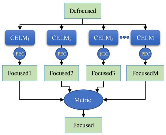 In this experiment, the degree of the polynomial (Equation (14)) was set to ; thus, each CELM had output neurons. AN entropy-based combination strategy was used in this experiment. To analyze the influence of CELMs number on focusing performance, M was chosen from . All CELMs had the same modules as illustrated in Figure 2. The number of convolution kernels was set to . The regularization factor was chosen from . For each CELM, 3000 samples were randomly chosen from the above training dataset to train the CELM. The batch size was set to 10. The NVIDIA 1080TI GPU was utilized to train and testing.