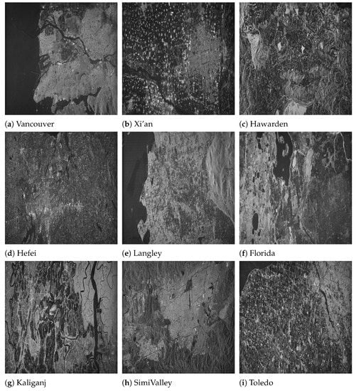 Nine groups of SAR raw data were used in the experiment, covering the areas of Vancouver, Xi’an, Heiwaden, Hefei, Florida, Toledo and Simi Valley. More detailed information, containing the scene name, acquisition date, effective velocity () and Pulse Repetition Frequency (PRF), is given in Table 3. All the raw data can be acquired from https://search.asf.alaska.edu/ (accessed on 25 May 2018) by searching the scene name. A world map of the nine areas is available from our code repository.