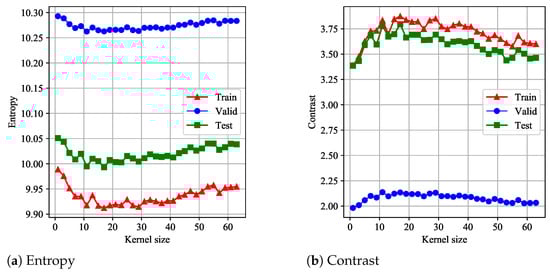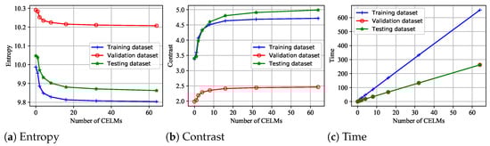 Firstly, we analyzed the influence of convolution kernel size (CKS) on the performance of the proposed model. In this experiment, the number of CELMs was set to 1, and the kernel size in azimuth was chosen from . After training, the entropy and contrast metrics were evaluated on the training, validation, and testing datasets, respectively. The results are illustrated in Figure 4. As we can see from Figure 4a,b, when , the performance was best. The corresponding entropy and contrast on testing dataset were 9.9931 and 3.7952, respectively.