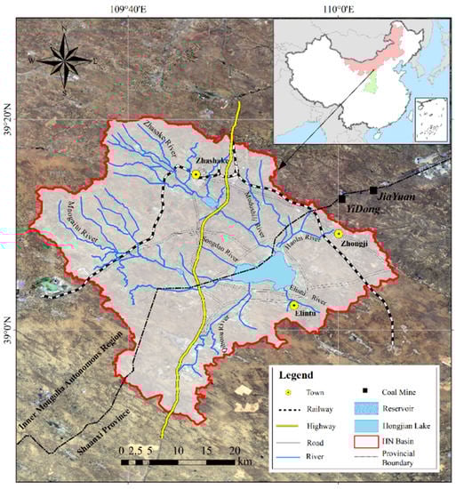 HN is located at the boundary between the Shaanxi Province (SX) and Inner Mongolia Autonomous Region (IM), China. In the mid-1990s, the lake surface area was 54.5  (Ma et al. 2014, Shen et al. 2005a) [,]. The HN basin is a naturally closed basin with an elevation of 1200–1417 m and a drainage area of 1352 . Seven seasonal rivers, the Qibosu, Zhashake, Mudushili, Songdao, Erlintu, Haolai, and Maogaitu Rivers, flow into HN. There are no hydrological and meteorological stations in the HN Basin (Yin et al. 2008). There are three towns in the HN Basin (Figure 1). The Zhashake and Maogaitu reservoirs were built on two main tributaries of HN in 2005 and 2010, respectively (Figure 2). The HN basin is surrounded by numerous coal mines and coal-related enterprises currently.