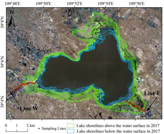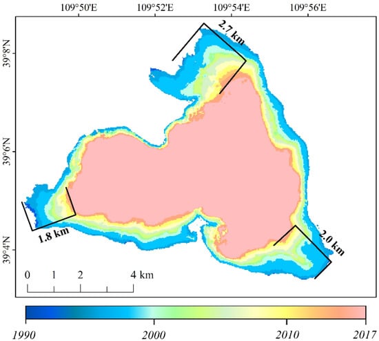 Figure 5 shows the changes in the spatial extent of HN during 1990–2017. The northwestern, southwestern, and southeastern parts of HN showed the greatest shrinkage toward the center of the lake with distances of 2.7, 1.8, and 2.0 , respectively. The mean of the recession distance to the center was 0.95 ± 0.58 km.