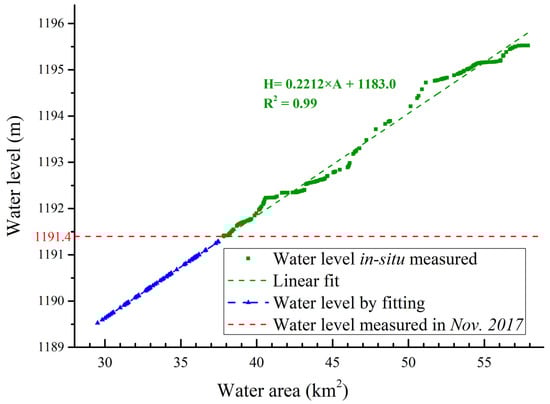 Using the water area time series extracted with Landsat data and the corresponding water levels derived from either interpolation or extrapolation, the hypsometric relationship curve between the water level and water area was built (Figure 4). The isobath heights of inundation areas less than the area in November 2017 were derived by the curve. Then, all the isobath heights were used to obtain the lake bathmetric map, and the concurrent water storage results were calculated.