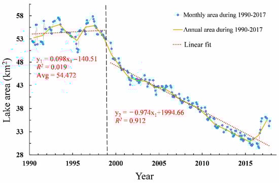 The monthly and annual changes in the HN water area (April–November over 1990–2017) are shown in Figure 6. The water area from 1990 to 1998 ranged between 50.1 (July 1995) and 57.9  (April 1997) with an average value of 54.5 ± 1.1 . The inundation of HN showed a significant decreasing trend with a decreasing rate of 1.19  (p < 0.001) during 1999–2015. The inundation of HN in 2016 represented only 56% of that in 1998. Substantial expansion was also observed between 2016 and 2017, during which the inundation of HN increased from 30 to 34 km2.
