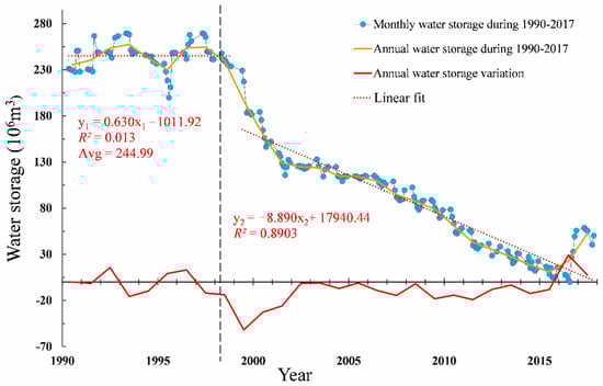 The monthly and annual changes in the HN water level and water storage during 1990–2017 are shown in Figure 7 and Figure 8. The maximum and minimum HN water level and storage were reached in April 1997 and July 2016, respectively, with the difference of 6.4  and 2.7 . In contrast to the relatively stable conditions before 1999, the water level and storage of HN showed a significant decreasing trend in the later period of 1999–2016 with a decreasing rate of 0.3  (p < 0.001) and 0.15  (p < 0.001). This situation has been reversed since July 2016. The water level and storage of HN increased by 1.6 m and 0.36  from July 2016 to October 2017, respectively.