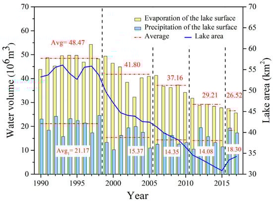 Since HN is an inner-flowing lake, its water is mainly consumed by human activities and lake evaporation. The annual average of water consumed by human activities () was  from 1990 to 1998. The  continued to increase after 1998 and reached a peak of  during 2010–2015. In 2016–2017, the  dropped to . The annual average of evaporation of the lake surface () was , , , , and  in five phases, respectively, which has the same trend with the lake area (Figure 9).
