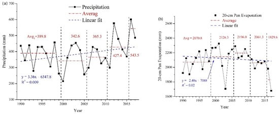 The variations of (a) annual precipitation and (b) 20 cm pan evaporation within the HN basin from 1990 to 2017.
