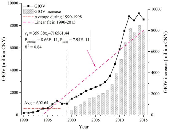 The annual average gross industrial output value in the HN basin increased to 8488 , which was 13 times that during 1990–1998 (Figure 11) with an annual increase rate of 13.33% (p < 0.001) after 2000.