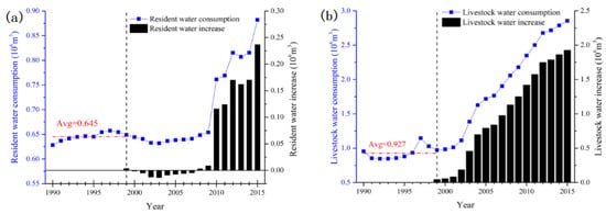 The variations of (a) residential water consumption and (b) livestock water consumption within the HN basin from 1990 to 2015.