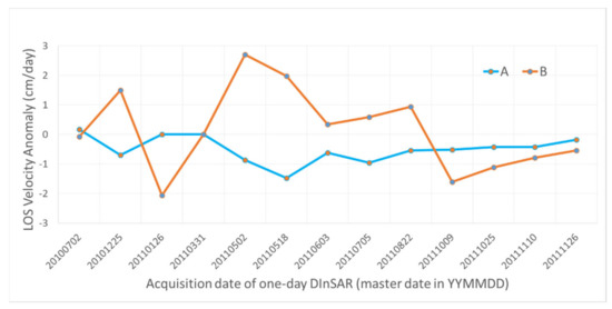 Figure 5 presents the temporal variation of the velocity anomaly in A and B at the centers of the dotted circles shown in the sub-images of Figure 4. The amplitude of velocity anomaly for A is ~1cm/day, which is smaller value than that of B with ~5 cm/day. Considering the range direction (from satellite to target) and the ice flow direction, a positive anomaly value means either acceleration of horizontal ice flow or inflation (uprising) of ice surface, or a mixture of both. Similarly, negative anomalies mean either slow-down in horizontal flow or vertical depression (subsidence) of ice surface, or a mixture of both. It is worth noting that the velocity anomalies are the ice velocity difference from the master DInSAR pair [20100616-20100617], and the negative values do not represent the reversal of directions of the actual horizontal flow or vertical motion, if any.