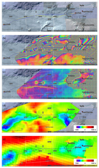 For grounded ice, the DDInSAR can be used to detect the difference of velocity field between the two DInSAR data. For DDInSAR operation, unwrapping the DInSAR phase was performed by using SNAPHU software [24] and the subtraction was also done by using the band math functions of SNAP. The first DInSAR pair [20100616_20100617] was used as a master data for all DDInSAR operations. Except for the Campbell Glacier Tongue, the DDInSAR phase would be constant for the stable regions and constant-flowing glacier surface. As exceptions to this, velocity anomalies over grounded glacier will be reported in Section 3.