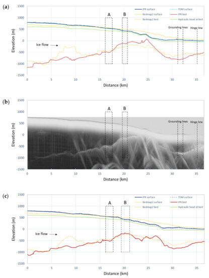 Figure 7 shows the profiles of the ice body along the IPR survey line. Figure 7a is along the survey line intersecting the center of anomaly A, but it slightly touches anomaly B. IPR surface profile matches almost exactly with TanDEM-X DEM, while there is a large discrepancy with Bedmap2 surface elevation of up to 200 m. IPR-derived surface elevation is about 100 m higher than Bedmap2 in the beginning of the profile, gradually crosses at a distance of 18 km, and lower than Bedmap2 by a maximum of 200 m. This is not a temporal change of ice elevation but is thought to be an error in Bedmap2, because IPR and TanDEM-X match very well even though they were obtained completely independently. The radargram in Figure 7b supports the credibility of IPR bed topography because a large bed hill observed in Bedmap2 at a distance of 6–12 km does not appear in the radargram. Moreover, the resolution along the IRP survey line is about 7 m, far better than Bedmap2 bed data with 1 km pixel spacing. The hydraulic head at the bed shows gradual ice flow, but it has a hill to prevent flow at a distance of 25 km, as shown Figure 7a. The flow should divert from the survey line to overcome the bed hill in Figure 7a.