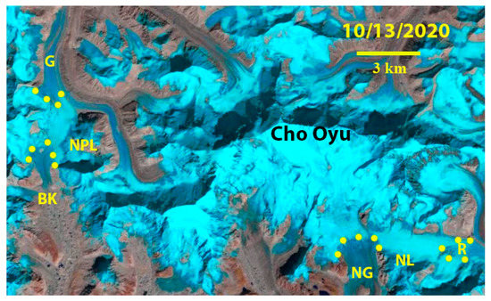 Glacier snow line on Mount Everest glaciers on 13 October 2020 as per a Landsat image. NG = Ngozumpa Glacier; NL = Nup La; R = Rongbuk West Glacier; NPL = Nangpa La; G = Gyabrag Glacier and BK = Bhote Koshi Glacier. Yellow dots mark locations of snow line elevation determination.