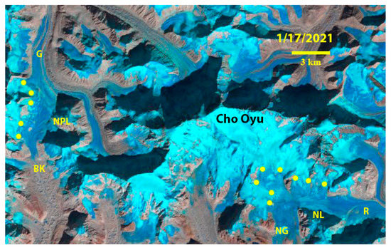Glacier snow line on Mount Everest glaciers on 17 January 2021 as per a Landsat image. NG = Ngozumpa Glacier; NL = Nup La; R = Rongbuk West Glacier; NPL = Nangpa La; G = Gyabrag Glacier and BK = Bhote Koshi Glacier. Yellow dots mark locations of snow line elevation determination.