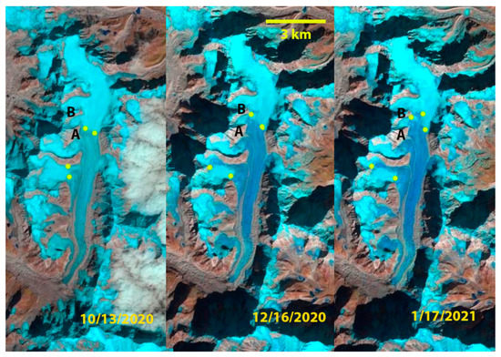 Transient snow lines on Rolwaling Glacier in Landsat images from 13 October 2020, 16 December 2020, and 17 January 2021. Yellow dots mark locations of snow line elevation determination.