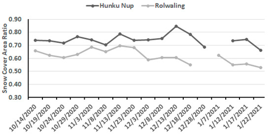 The Landsat image for 1 January 2021 indicated no appreciable change in the snow line over the last two weeks of December (Figure 5a). On 4–5 January 2021, a minor snow event (1.8 mm water equivalent precipitation at Everest Base Camp) covered the glaciers. A Sentinel-2 image from 7 January 2021 indicated new snow cover on most glacier areas in the 5000–5900 m region (Figure 5b). This snow cover was subsequently ablated during an unusually warm period that extended from 10–15 January 2021 as evidenced by the 17 January 2021 Landsat 8 image (Figure 5c) and 22 January 2021 Sentinel-2 image. Both images indicate the snow line elevation increased by 25–75 m from the 16 December and 1 January positions near Nangpa La on the Bhote Koshi Glacier, near Nup La on the Ngozumpa Glacier, and Rolwaling Glacier. The snow line for the 17–22 January period averaged 5929 m, representing a 210 m rise since 13 October, and a 40 m rise since 16 December (Table 1). The snow-covered areas of Hunku Nup and Rolwaling Glacier had declined to 65% and 53%, respectively, by 22 January 2021 (Figure 6). The rise in snow line elevation and decrease in snow covered area from the 13 October–22 January indicate that the ablation season continued well into the winter season.