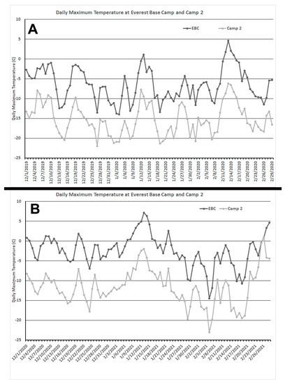 Daily maximum temperature at Everest Base Camp and Camp 2 for the winter seasons of (A) 2019/2020 and (B) 2020/2021.