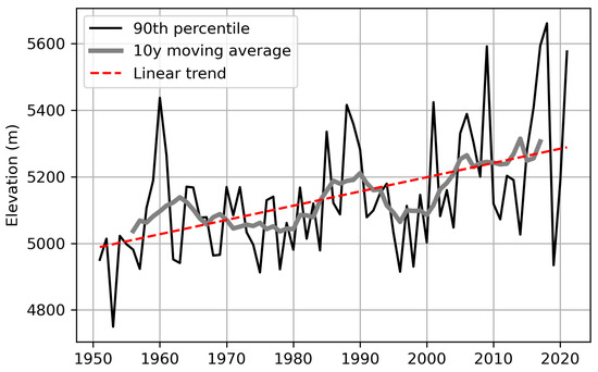 A six-decade-long mass record of glaciers in the Mount Everest region compiled by [1] found increasingly negative balances each decade, with thinning evident at an elevation up to 6000 m. The mass balance loss has been driven by increased summer ablation and rising freezing levels during the summer monsoon [2,3]. The higher freezing line during the summer monsoon identifies that the elevation where frozen precipitation predominates in the area has risen to 5400 m [4].
