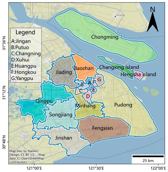 Shanghai is one of the four municipalities directly under the control of the central government in China, located at the T-junction of China’s coastal economic belt and the Yangtze River economic belt. Shanghai’s administrative area is 8359 square kilometres, of which the land area is 6737 square kilometres. Since the Chinese government’s implementation of the reform and opening of the country, Shanghai has rapidly developed into an important global economic, financial, trade, shipping, scientific and technological innovation centre and cultural metropolis. Regarding its geographical coordinates, Shanghai covers 120°52′E~122°12′E, 30°40′N~31°53′N (Figure 1). From the perspective of the world, it is located in the east of the Asian continent and on the west side of the Pacific Ocean, with the Yangtze River to the north, the East China Sea to the east, Hangzhou Bay to the south, and Zhejiang and Jiangsu to the west. As shown in Figure 1, its administrative scope includes 16 districts.