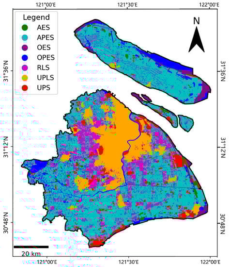 Since the theory of mixed land use was introduced into China at the beginning of the 21st century, scholars have explored the meanings and practices of mixed land use from the perspectives of spatial layout and urban development. After more than 20 years of development, China’s theoretical research in this field has become increasingly refined. Taking urban land as their research object, Wu et al. established a spatial classification of land use based on the “production, living and ecology” functional framework []. Based on their research, this paper divided the land in Shanghai into seven types according to their functions: urban production and living space (UPLS), rural living space (RLS), urban production space (UPS), agricultural production and ecology space (APES), agricultural ecology space (AES), other production and ecology space (OPES) and other ecology space (OES). The land use types included in different carrying spaces are shown in Table 1. The divided urban mixed-function spaces are shown in Figure 4.