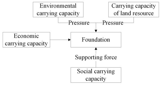 Rapid urbanization and expanding demand for resources and services are exerting great pressure on land and natural resources []. Since the 1960s, the global population has grown exponentially. The use of some resources is limited, which has led to the attraction of widespread attention to the problem of the earth’s carrying capacity [,]. After 40 years of reform and opening, China has gradually developed from a poor and weak developing country to the second largest economy in the world. Urbanization and industrialization have been the main themes of these years. In this process, urban diseases are not a simple problem of food shortages and environmental pollution but involve all aspects of production and human life and health. At the national level, many high-level policies and regulations have been sought to enhance urban carrying capacity []. Urban carrying capacity has gradually become a topic of intense interest and research among scholars.