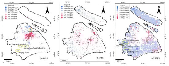where is the value of the spatial weight matrix in row of column , or represents the observed value of spatial unit or , and is the expectation. The commonly used confidence levels for a space’s cold and hot spot analysis are 99%, 95% and 90%. When the target cannot be searched at a 99% confidence level, the requirement can be relaxed to 95%, or even 90%. This paper analyzes the distribution of cold spots in Shanghai at these three confidence levels. The results show that the desired results can be found under a 99% confidence level.
