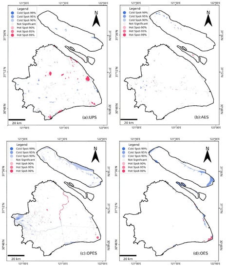Urban production spaces are scattered around the urban area of Shanghai (Figure 7a), and the distribution of cold spots in the space is also relatively dispersed. Effective measures to enhance the carrying capacity of these regions would be to establish a high-quality business environment, work to reduce the number polluting enterprises, guide industrial transformation and upgrades, and actively improve public facilities and services. Figure 7b shows that agricultural ecology space is scattered across most areas of Shanghai. After the analysis of spatial hot spots, it was found that although there is a significant presence of cold spots, the cold spots are small and not interconnected, so the magnitude of their overall share of space is not large. Figure 7c shows that other production and ecology spaces are mainly distributed in western Shanghai and northeastern Chongming. In the space exploration, no obvious cold spots appear. Figure 7d shows that other ecology spaces are mainly distributed in southeastern Chongming, the coastal areas and the surrounding Changning Island. Spatial hot spot analysis also revealed no statistically significant cold spots. Generally, cold spots in this category are not easily detected due to the scattered distribution of these urban spaces and the weak degree of carrying capacity imbalance.