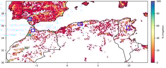 Figure 2 illustrates the Global Map of Irrigated Area (GMIA) version 5 for the study area []. This product was initially developed by Döll and Siebert [] and then enhanced to obtain 5 arc minutes resolution maps []. The reference years for the statistics used to establish the map differ between countries but in most cases, the data refer to the period 2000–2008. Despite several shortcomings detailed by the authors, this map remains the FAO reference today. Figure 2 represents the percentage of area equipped with irrigation from 0 to 100%. The 0% corresponds to rainfed areas. The 100% corresponds to areas fully irrigated.