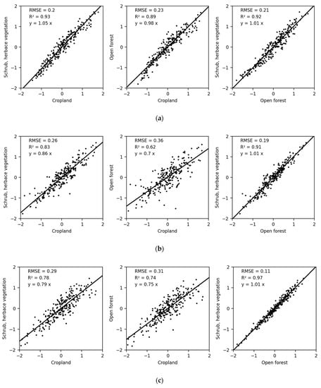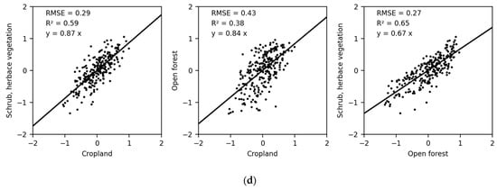 Figure 3 shows a cross-comparison of the VAI between the different land uses at the four test sites identified in Section 2.1. All monthly VAI estimates are displayed, each point corresponds to the VAI calculated for a given month. In each figure, the statistical parameters R2, RMSE, and the linear relation between the VAI of the two considered land uses (Y = a.x, a is the slope) are illustrated. For the case of two land uses with very close VAI indices, we should find an RMSE close to zero, an R2 close to 1, and a slope close to 1.