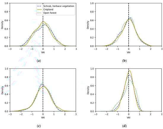Distributions of the VAI values for the three land uses (crops, shrub and herbaceous vegetation, and open forest), (a) Kairouan; (b) Ain Dafla; (c) Rif; (d) Andalusia.