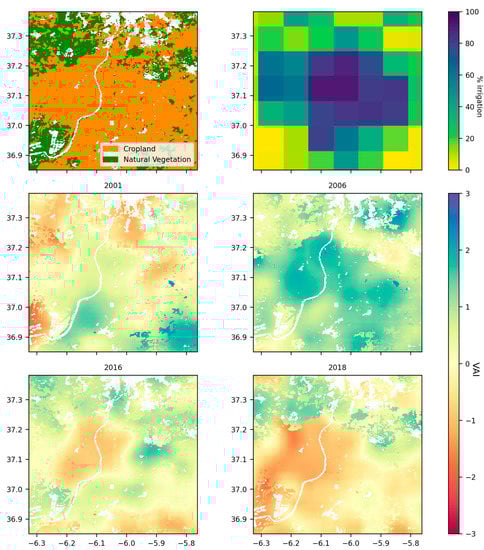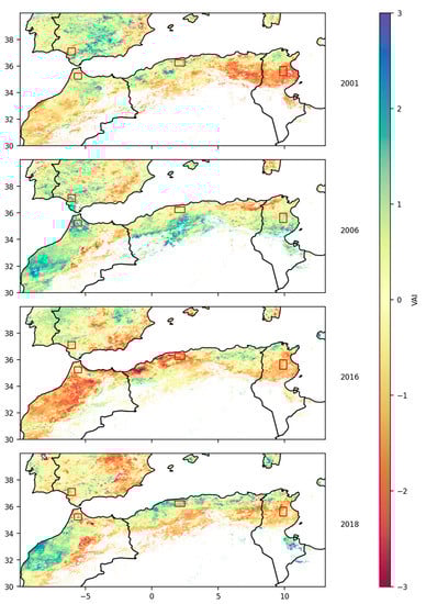 Figure 6 illustrates the VAI maps calculated based on these two land-use classes in March for four specific years, two dry years (2001 and 2016) and two wet years (2006 and 2018). The drought index calculated in the natural zones was a priori without anthropogenic effects and was thus the most correlated to the climatic effects of drought.