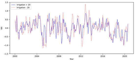 Over the Andalusia site, Figure 9 illustrates the intercomparison between the estimated VAI in areas irrigated at +20% and other rainfed agricultural areas or areas with irrigation levels below 20%. Higher extremes were generally observed for areas with no or low irrigation levels. This result could be explained by a climate with more extreme conditions related to drought or heavy rainfall. The irrigated context was less variable (amplitude of 1.88 versus 2.65) because of the organized irrigation management. Both curves had a negative trend, which was much higher for non-irrigated areas (−0.0006 per month) than for irrigated areas (−0.0013). This result could be explained by the strong conversion of seasonal crops to olive groves in Andalusia. According to agricultural statistics, the share of olive groves increased by 30% from 1993 to 2018, while the share of seasonal crops decreased by 43% during the same period []. Marked differences between the two curves were observed, especially in the summer months. In 2005 and 2012, the VAI of the irrigated area was significantly higher (>0.5) than that of the non-irrigated area. In 2005, less rain occurred than had previously in the past 20 years, and according to agricultural statistics, the sunflower, a typical summer crop that represents an average of 14% of the total cropped area of Andalusia, experienced a severe drop in the cropped area in those two years. Jimenez et al. [] also recorded a high percentage of crop damage during those years. In the summer months of 2007, 2008, 2013, and 2018, the situation was the opposite. The VAI of the irrigated area was significantly inferior (<−0.5) to that of the non-irrigated area. Yearly agricultural statistics do not provide a satisfactory explanation of this scenario. Jimenez et al. [] did not report crop damage, and there was no high level of distress in terms of reservoir storage. However, the yearly rain records of 2013 and 2018 were substantially above the mean, which could explain the survival of vegetation in the summer and probably the early harvest of winter crops.